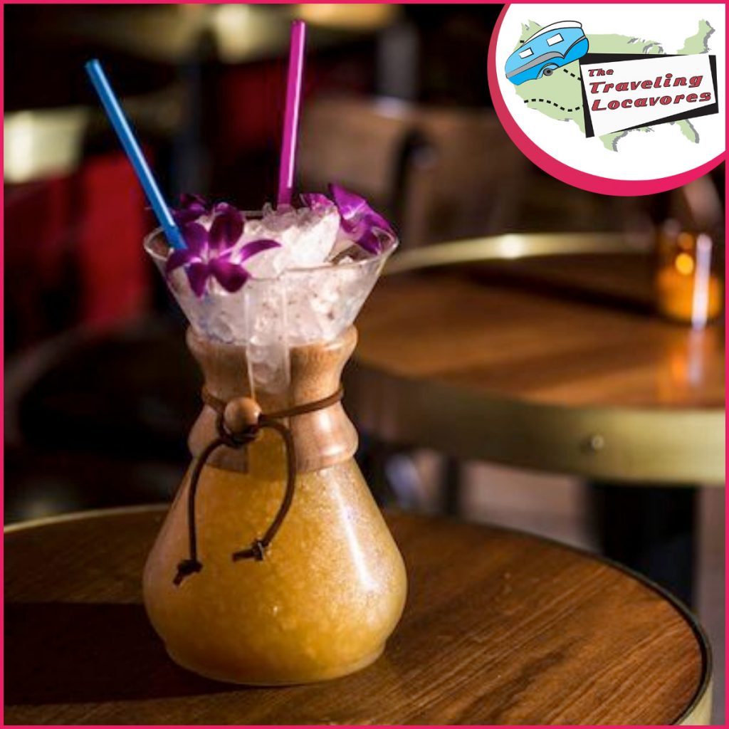Divide recipe between 2 tins and blend with measured ice. Pour into a 12 oz vessel. Garnish with orchids and grated coffee.
